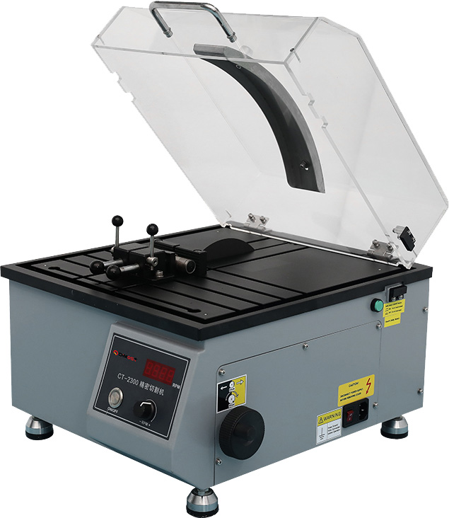 Прецизионный ручной отрезной станок CT-2300 ‒ это простой в управлении настольный отрезной станок с регулируемой скоростью резки. Применяется для резки печатных плат, полупроводниковых компонентов, керамики, кварцевого стекла и петрографических образцов